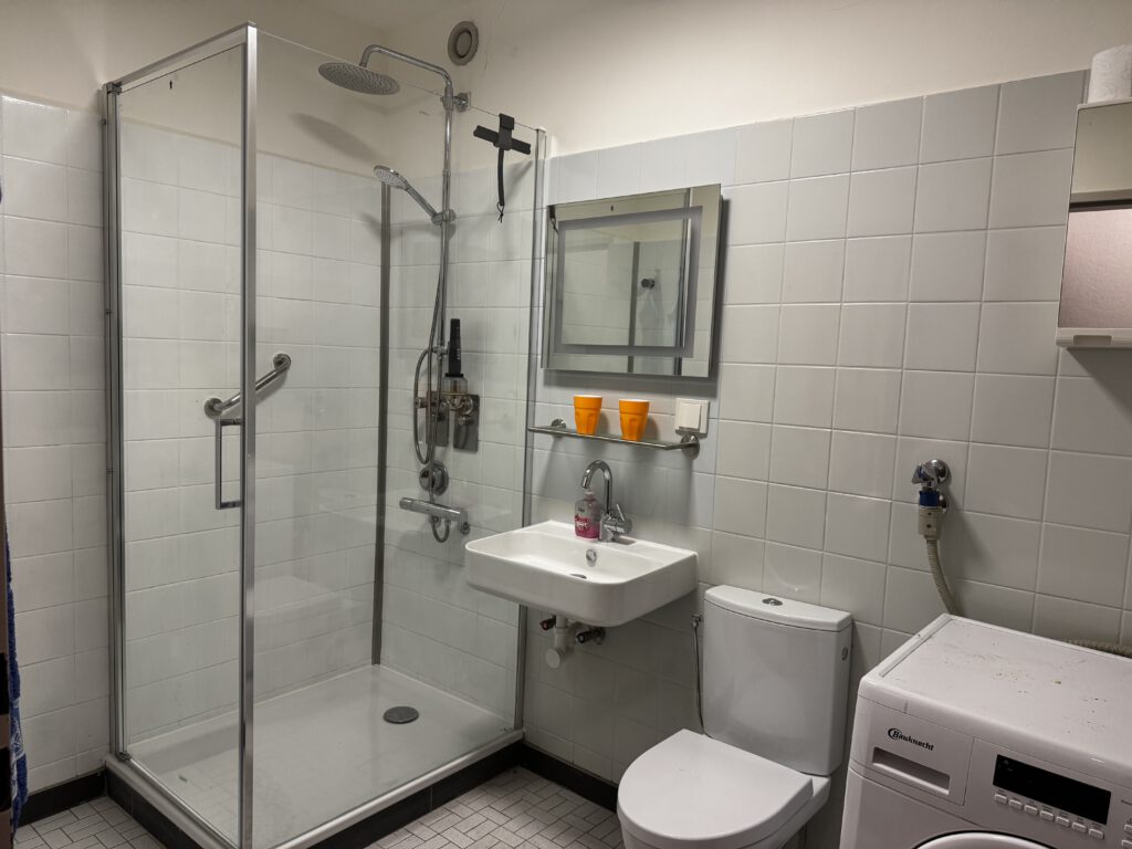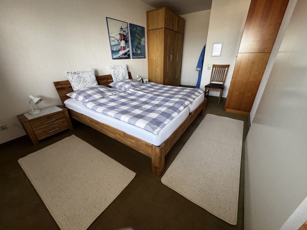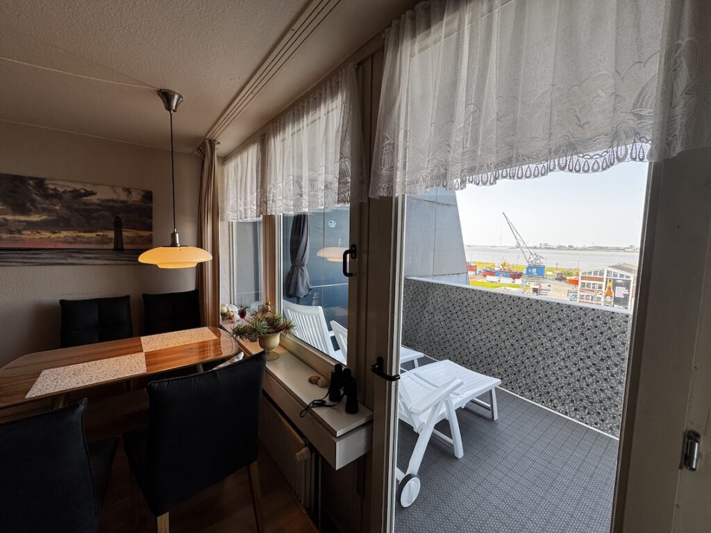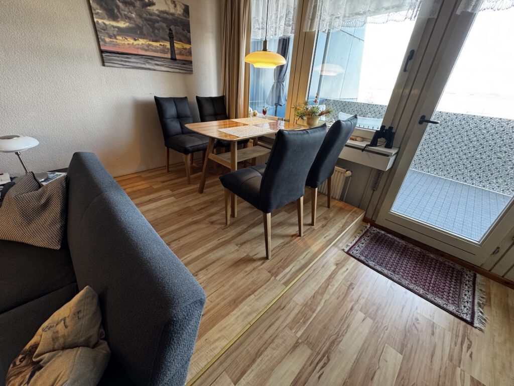 Durch Klicken auf ein Bild gelangt man zu einem „Diaprojektor“! Übersicht Wohnraum Fernseher 55″ Diagonale Essecke Essecke mit Blick auf die Weser Spüle mit Kaffeepadmaschine Blick in die gesamte Küche Sitzecke auf dem Balkon Liegen auf dem Balkon Grundriss